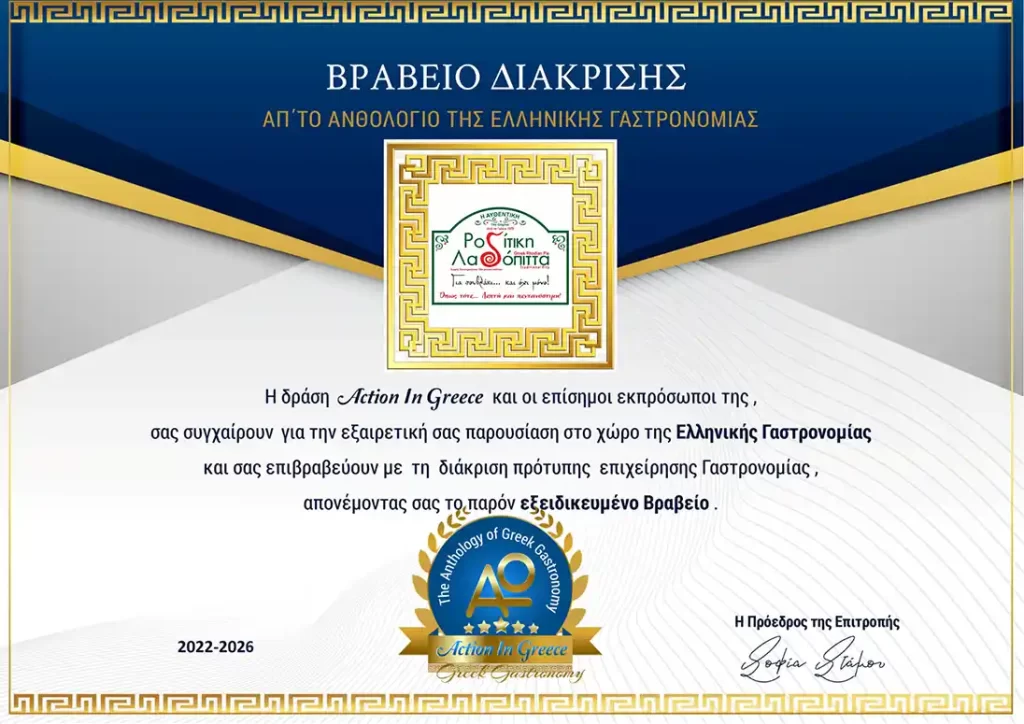 Η βράβευση της επιχείρησης μας με την ανώτατη διάκριση των 5 αστέρων από το παγκόσμιο brand Action In Greece, αποτελεί επισφράγιση της ποιότητας και της αυθεντικότητας της Ροδίτικης Λαδόπιττας. Μέσα από μια αυστηρή, πολυπαραγοντική διαδικασία αξιολόγησης, η επιχείρηση αναδείχθηκε ως πρότυπο της ελληνικής παραγωγής, συνδέοντας την παράδοση με τη σύγχρονη γαστρονομική ταυτότητα της χώρας. Η διάκριση αυτή δεν αφορά μόνο την εξαιρετική γεύση, αλλά και τη συνολική συμβολή της επιχείρησης στην ανάδειξη της εντοπιότητας, την ενίσχυση της τοπικής κοινωνίας και την καθιέρωση της Ελλάδας ως κορυφαίου γαστρονομικού προορισμού παγκοσμίως.